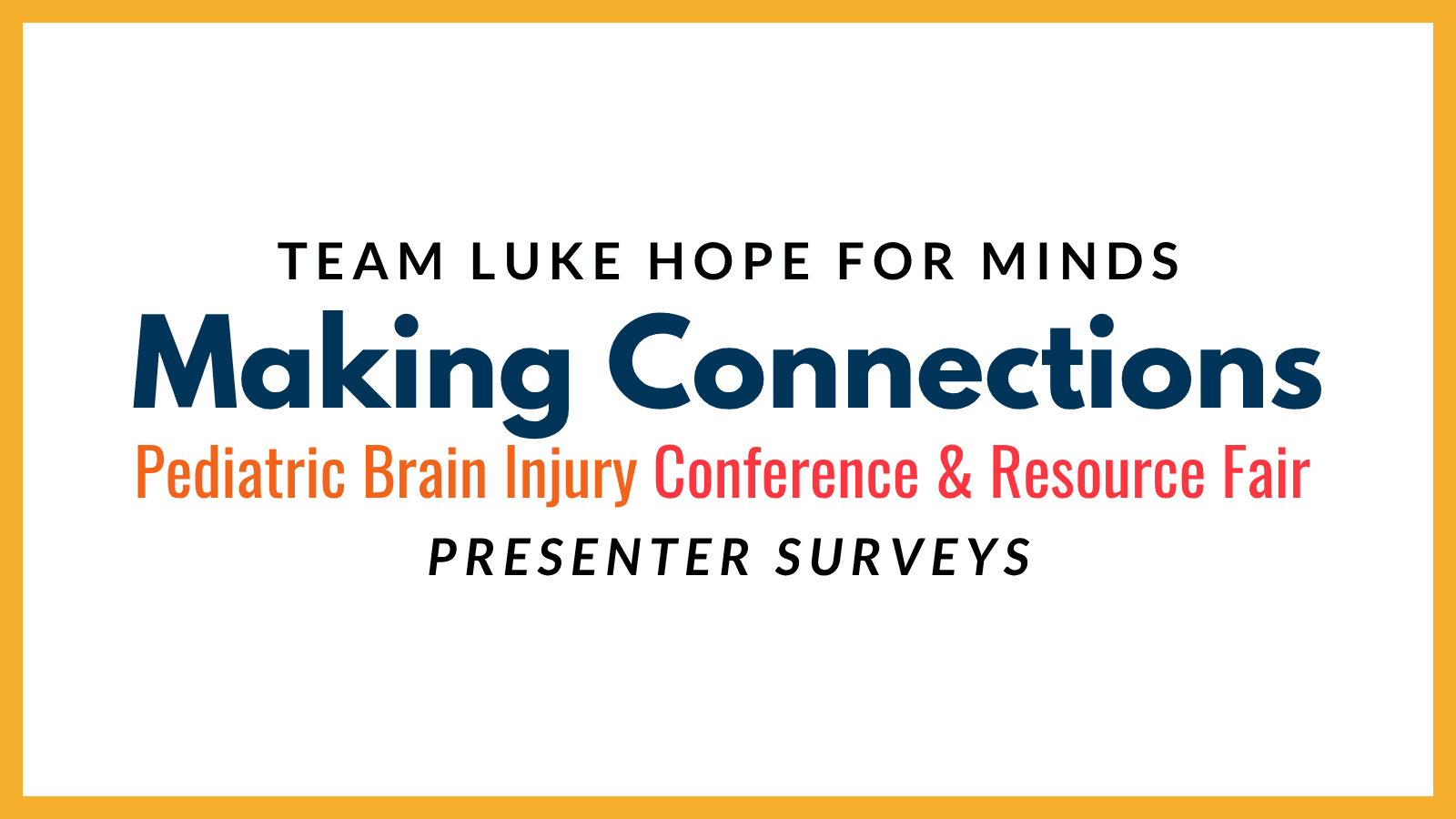 Thank you for joining us at the 9th Annual Making Connections Pediatric Brain Injury Conference and Resource Fair! Your feedback helps us continue to grow and improve each year. Please take a moment to complete our surveys.